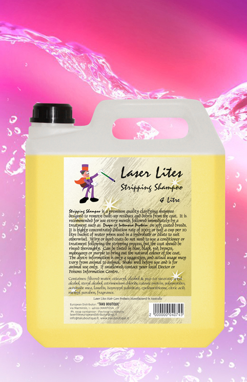 STRIPPING SHAMPOO è un prodotto di qualità superiore previsto per rimuovere tutti i residui di olio, balsami, guaine dal mantello del Vs cane, o gatto.. Deve essere utilizzato tutti i mesi, seguito immediatamente da un trattamento come Drape o Protein sulle razze a pelo morbido. E' un prodotto altamente concentrato . Per la rimozione dei residui misti la concentrazione da usare e' un po' piu' alta del normale. Puo' variare da 80/100 ml in un litro di acqua. Per i peli duri o ruvidi la concentrazione di shampoo e' 50 ml in 1 litro di acqua e non e' necessario l'utilizzo di in balsamo. Se si vuole si puo' usare Protein tr per le frange . Si raccomanda un accurato risciacquo . Trattasi di meri consigli per l'utilizzo. L'effettivo utilizzo del prodotto potrà variare da animale ad animale. Agitare vigorosamente il prodotto prima dell'uso. Si tratta di un prodotto da utilizzare solo sugli animali. Se ingerito, contattare il medico oppure il centro antiveleni locale.